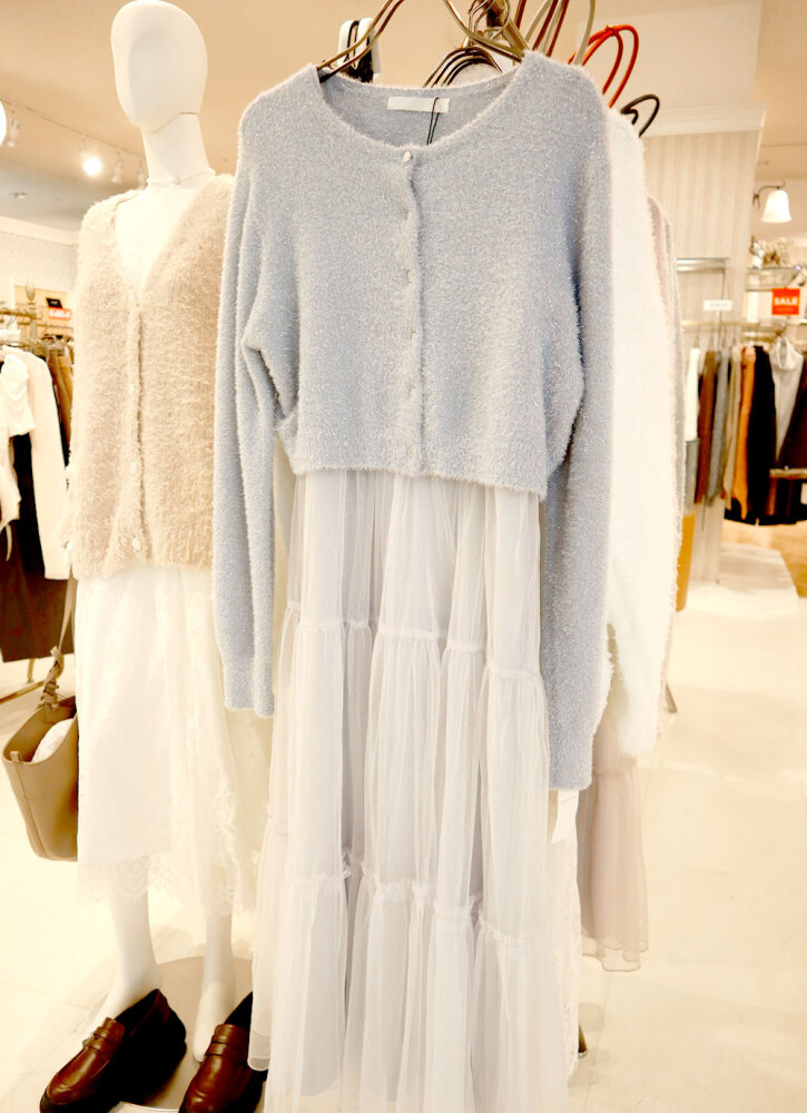 こちらも「COCODEAL」。光沢感のあるカーディガンは、中にシャツを入れたり、ジーンズと合わせても相性が良いので、かなり着回しができそう。ふんわりワンピースでエレガントな着こなしが楽しめます。