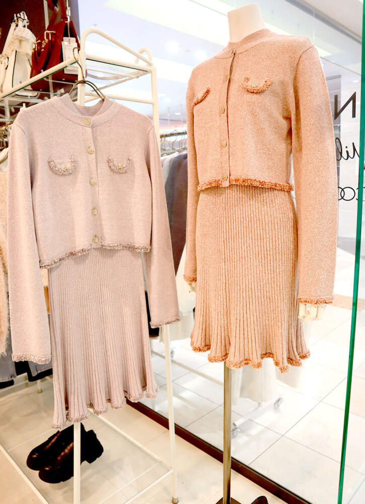 「LILIAN CARAT」のニットジャケットとワンピースのセットアップ。色合いも華やかできれいめのラインだけど、ニット素材なので着やすいのがポイント。普段使いはもちろん、入学式などのセレモニーや授業参観や発表会などにも重宝できそう。