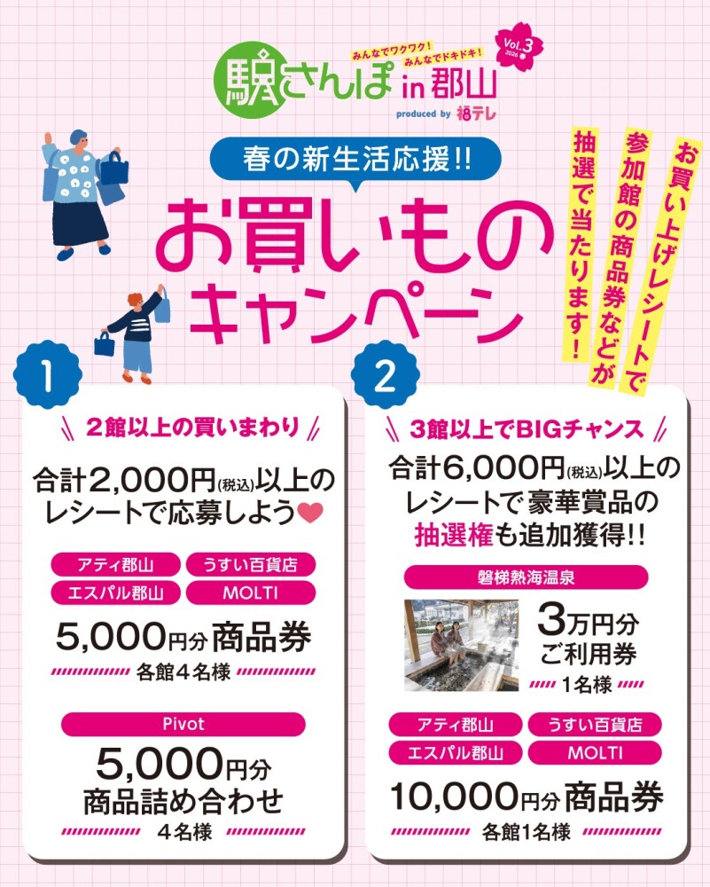 郡山駅前の商業施設「ATi」「うすい百貨店」「S-PAL郡山」「Pivot」「MOLTI」5館でお買物すると上記の賞品が抽選で当たります。