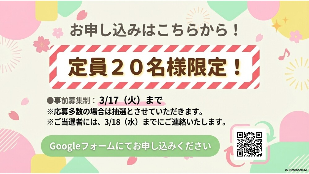 定員20名様限定となりますので、お早目に下記アドレスかQRコード(Googleフォーム)から