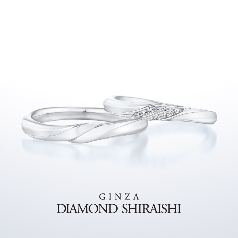 プラチナの立体感で結ばれたふたつのラインから、日常に溶け込みながらも確かにそこにある愛を感じられます。心地の良いウェーブ感と、メレダイヤモンド(*)の輝きですべてを愛で包み込むような柔らかさ(右)、角度の違う面の陰影により力強さとしなやかさを表現したリング(左)です。